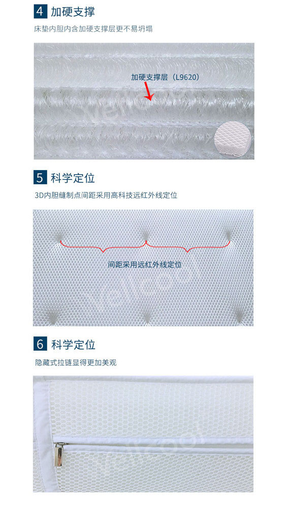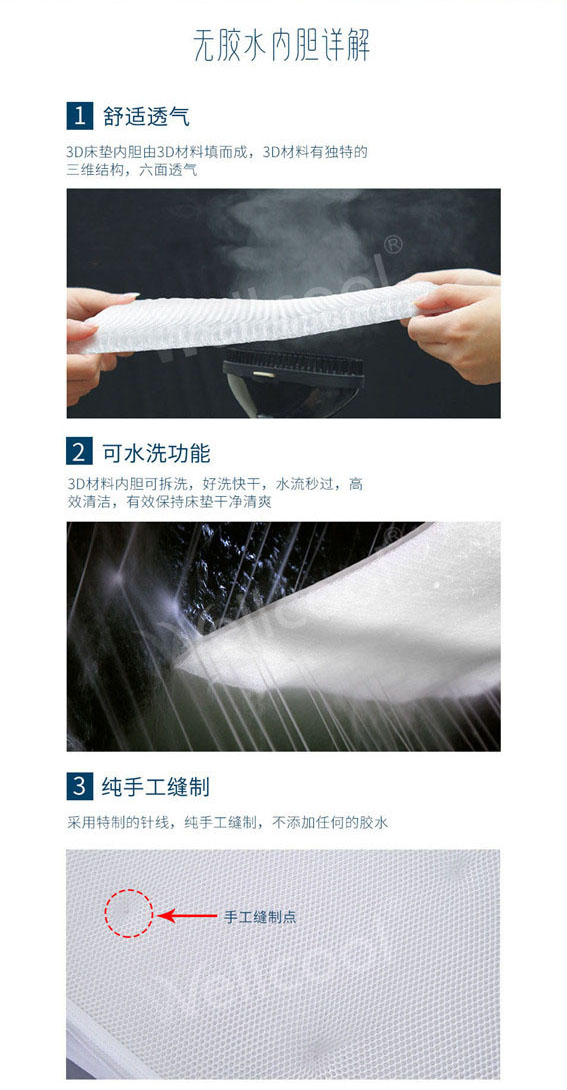響應(yīng)“生態(tài)環(huán)保健康”的號召,沃爾康團隊研究出了一款無膠水床墊內(nèi)膽,內(nèi)里的芯材采用3D材料填充,采用特制針線純手工縫制,無添加任何膠水,床墊縫制點采用遠紅外線定位。