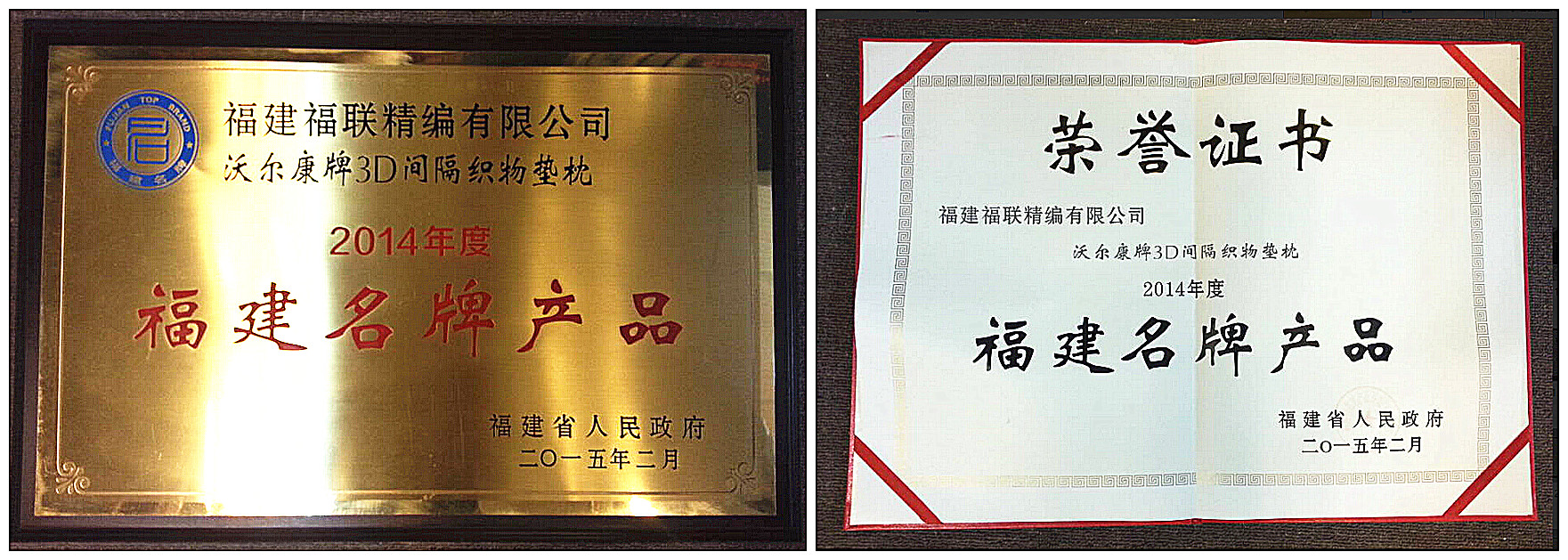 省政府授予“沃爾康牌3D間隔織物墊枕”福建名牌產(chǎn)品稱號(hào)